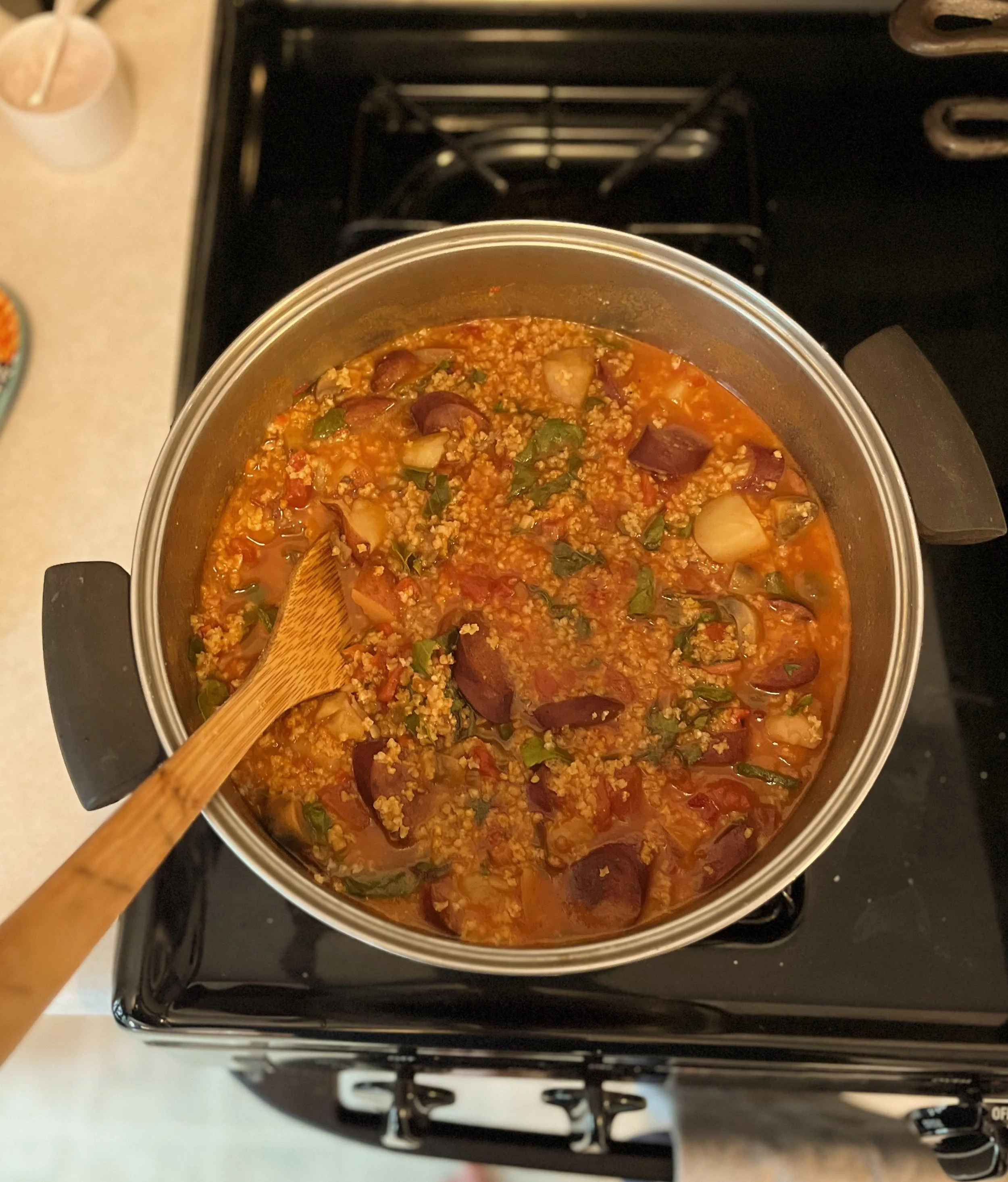 Brothy sausage, greens + millet soup